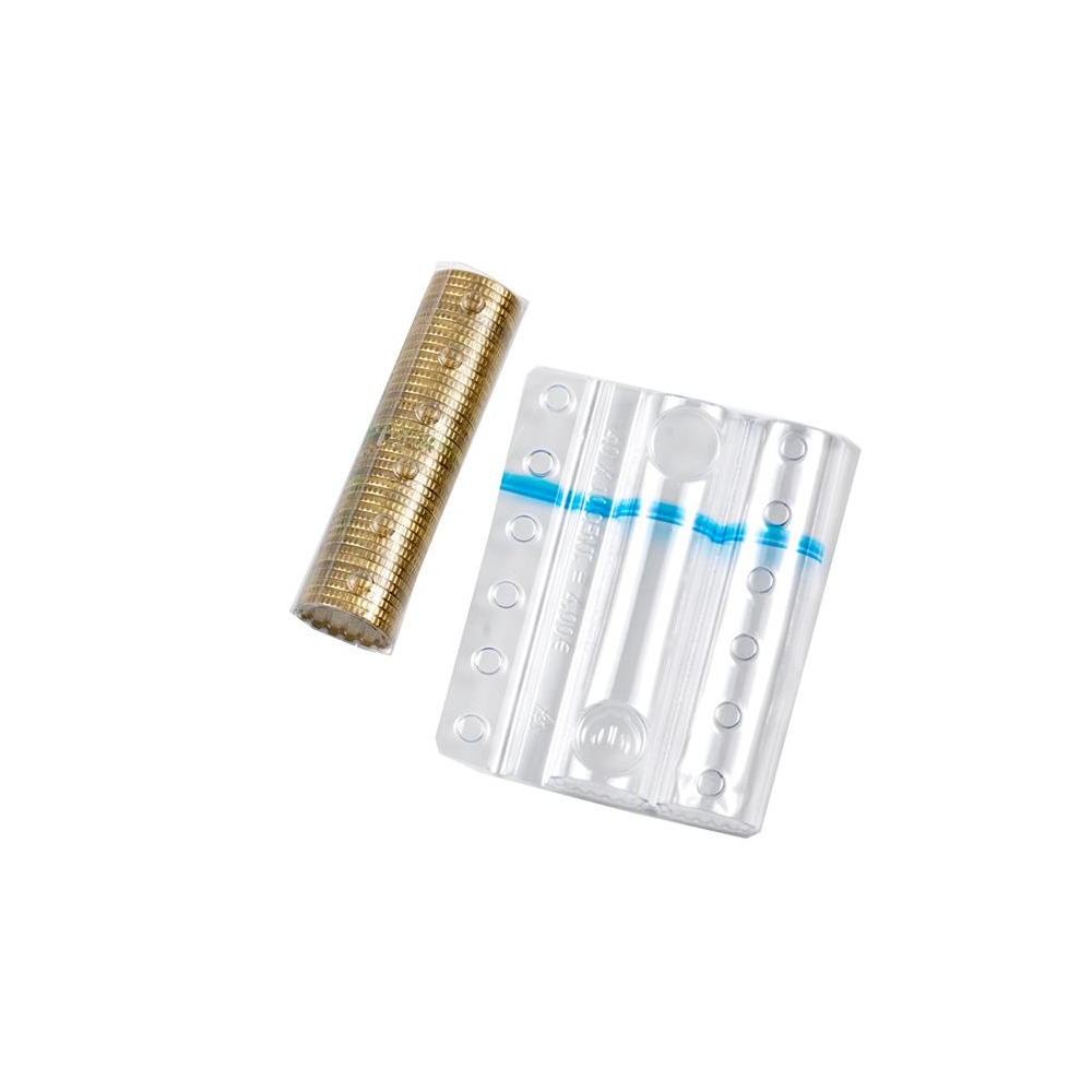 Blister in materiale plastico trasparente da 200 micron, con fascia colorata differenziata per facilitare la distinzione tra i vari tagli di monete. Versione utilizzabile anche da persone non vedentie ipovedenti. I simboli di ? (euro) e C (cent) edi relativi numeri corrispondenti al valore contenuto sono stati realizzati in embossing, al fine diconsentirne la lettura tattile.