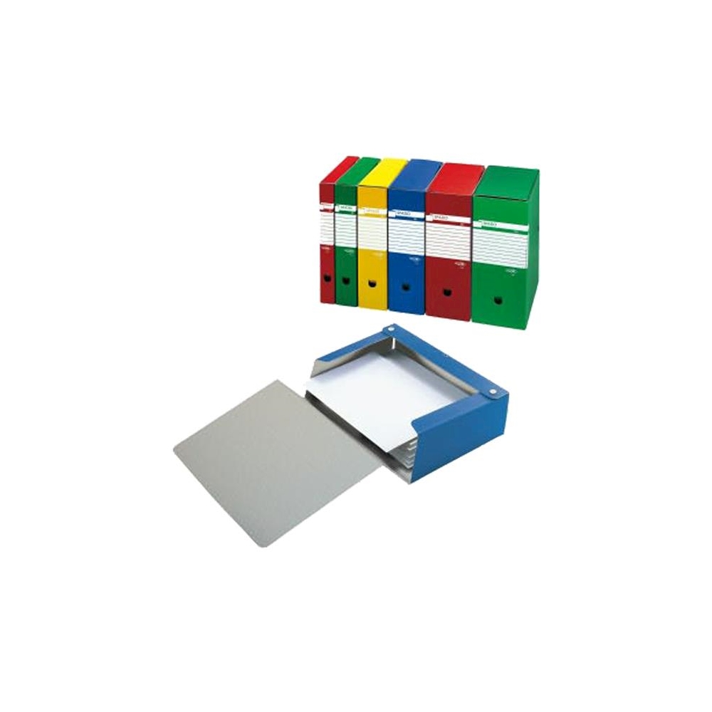 Cartelle in cartone monorivestito in PVC, chiusura a tre lembi con bottoni automatici. Dotate di etichetta stampata sul dorso e occhiello di estrazione. Formato utile 25x35 cm.